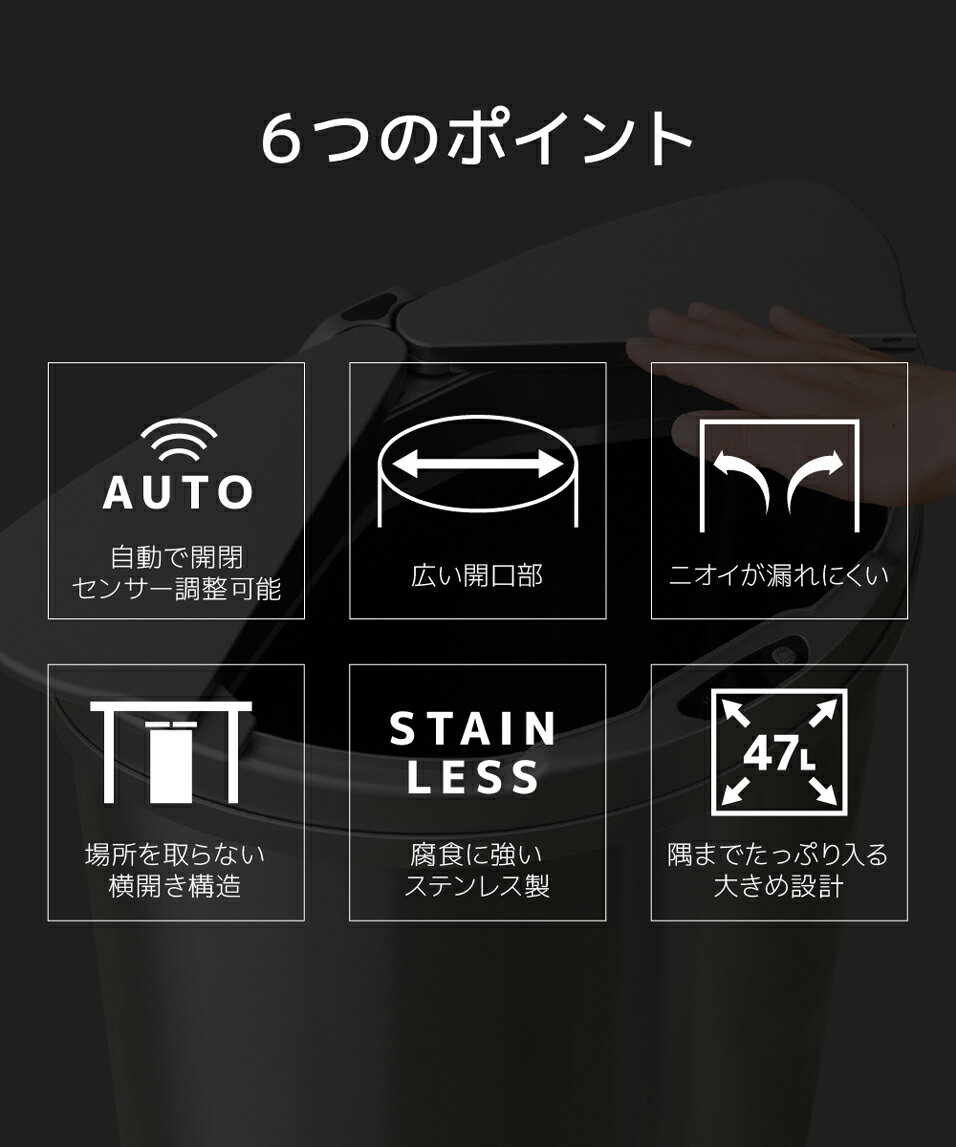 横開きステンレス自動開閉ゴミ箱 の詳細 手をかざすだけで蓋が開く自動開閉式ゴミ箱。