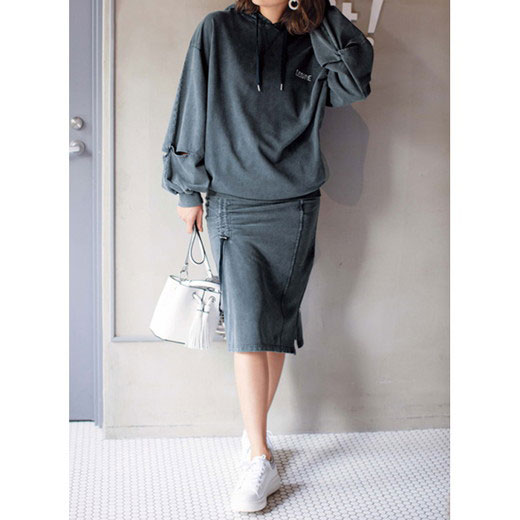 ゆるパーカーとドロスト&裾ファスナー付きのタイトスカートでメリハリもメイク。