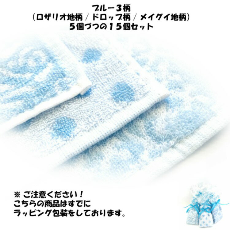 プチギフト ハンカチタオル15個セット(ブルー)【ブルー系3柄5個づつ】リボン付きラッピング袋入りタオルハンカチ 20cm×20cm ハンドタオル 個包装 まとめ買い メンズレディース子供 保育園 退職 卒入園 卒業入学 引越し [タオルマーサ]
