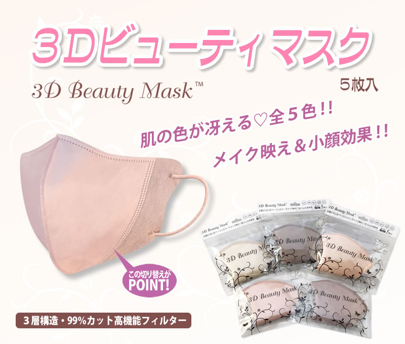 不織布 小顔効果 血色カラー 肌の色が冴える ///話題の血色マスク!不織布で作りました/// ◎お肌になじむオシャレなニュアンスベージュ・血色カラー全5色 ◎小顔効果抜群のナナメ切替えライン ◎呼吸がしやすい3D立体型 ◎3層構造・99%カット超薄型高機能フィルター ◎風邪・花粉症対策に ◎持運び便利なジッパー付パッケージ ※本商品はウィルスなどの感染を完全に防ぐものではありません。