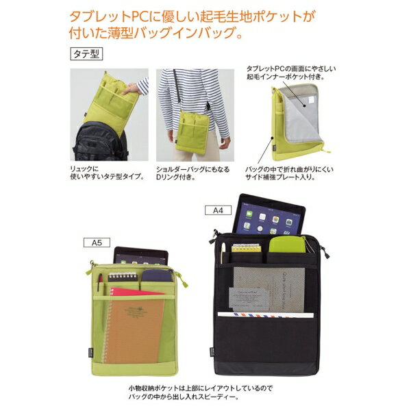 SMART FIT ACTACT バッグインバッグ(ヨコ型)SMART FIT ACTACT バッグインバッグ(ヨコ型)SMART FIT ACTACT バッグインバッグ(タテ型)バッグインバッグA5【SMART FIT ACTACT バッグインバッグ(タテ型)】広告文責(有)イースクエアTEL:0120-532-772タブレットPCに優しい起毛生地ポケットが付いた薄型バッグインバッグ。