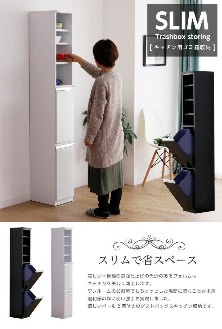 ■商品説明(Description of item) スリム型の一人暮らしの狭いスペースにもおけるスリムタイプのごみ箱2個付きキッチン収納です。