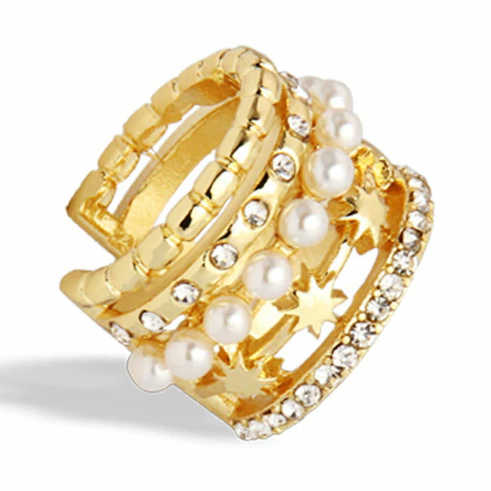ファイブリングスターパール イヤーカフ 片耳用 1個販売 星 真珠 クリスタル メンズ レディース イヤリング イヤークリップ フェイクピアス 耳 軟骨 キラキラ 挟む はさむ ラインストーン ゴールド 金色 ノンホールピアス 2次会 結婚式 パーティ 5連風 流行 オシャレ