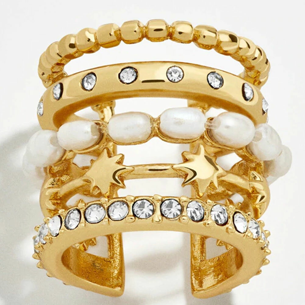 クリスタルのイヤーカフやゴールドのイヤーカフ、イミテーションの真珠パールのイヤーカフや星のイヤーカフなど5つつなげた5連風のおしゃれな大人のノンホールピアス。