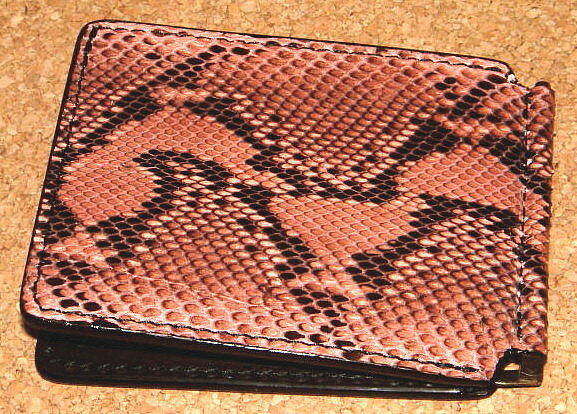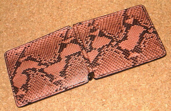 商品詳細 素材 ・錦蛇革”ダイヤモンドパイソン” (表革に使用) ・牛皮革”イタリアンレザー”(ベースに使用) サイズ ・縦約9.1cm×横約11.8cm×厚み約1cm ※日本札対応サイズです! カラー ・ピンク ※画面上と実物とでは色具合が異なって見える場合もございますのでご了承ください! 今作は≪高級 パイソン革仕様 マネークリップ (札ばさみ)≫です! 一切の装飾を省いた【SIMPLE IS BEST】なデザインの、綺麗目なスタイルの≪マネークリップ (ショートウォレット)≫です! ビジネスラインでもご使用いただけるように薄手の財布に仕上げました! スーツジャケット(上着)の内ポケットへの収納の際にも厚みが気にならず、バッグの中への収容にも適しておりますので、普段スーツでお仕事をされている方にもご満足いただける仕上がりです!! 表面の革には貴重な特注の”パイソン(錦蛇)革”を使用しています! 今作では「フロントカット」といわれる背中側の一枚物を使用しており、蛇特有の背中の鱗とその模様はとても迫力があります!! ベース(本体)の革質には、最高品質のイタリアなめしの牛革【ブッテーロ(イタリアンレザー)】を使用、革の密度が高く耐久性に優れており、安心してご使用いただけます! 【イタリアなめしの牛革】は世界で最も品質が高く、使い込むごとに革本来の天然の艶が現れ風合いが増し、より雰囲気良く育っていきます! 国内のこういったウェスタン系やバイカー系のブランドでは取り扱われることが少ないのですが、とてもクオリティーの高い本当にお薦めの革質です!! また、カードケースの裏等の革裏部分には引っかきに強い【豚革】が張り合わされており、より機能性と耐久性が高められたクオリティーの高い仕上がりです! 色は人気の「ピンク」、使用を重ねるごとに上品な艶が現れ色味が増し、とても雰囲気が良くなります! サイズ(折りたたんだ状態で)は「縦約9.1cm×横約11.8cm×厚み約1cm」、スマートな薄型タイプです! ご使用方法は(写真では分かりにくいのですが)、 財布中央の金具が開閉してお札をピタっととめますので、使い方も簡単でお札もいたみません。