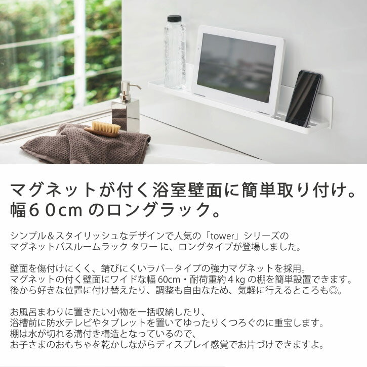 ▼ tower(タワー)シリーズ ▼ ・マグネットバスルームラック タワー (幅18cm) ・シリーズ一覧はこちら サイズ (約)幅60×奥行き8.5×高さ8cm 素材・材質 本体:スチール(ユニクロメッキ+粉体塗装) マグネット 滑り止め:シリコーン 付属品 フック×3 耐荷重 (約)4kg 取り付け可能な壁面 磁石が付く平らな面・スチール壁面 キーワード シャンプーラック マグネット tower バス 収納 ディスペンサーボトル置き 棚 ワイド 幅60cm お風呂場 洗面台 洗面所 シンプル おしゃれ ホワイト ブラック YAMAZAKI 山崎実業 4858 4849202007-01