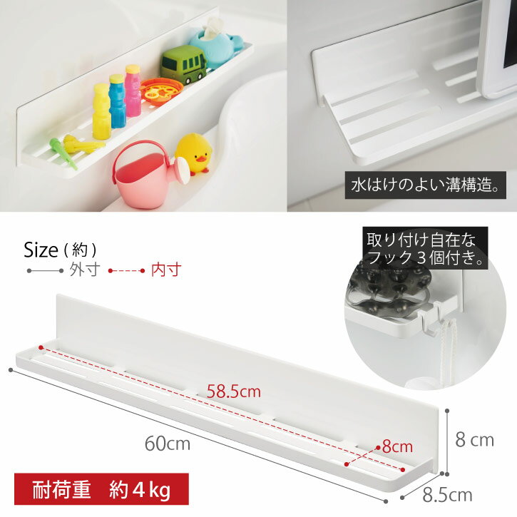 幅約60cmのロングサイズで石鹸・歯ブラシ・タンブラーなどの収納や、ディスペンサーボトルの追加棚として便利なラック。