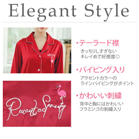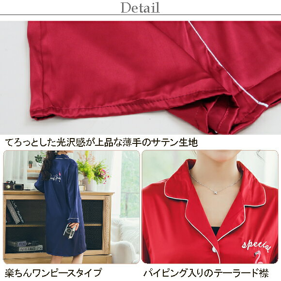 サテンの光沢感がエレガントなパジャマ ワンピースタイプなので着心地抜群 優雅な休日を過ごすリラックスウェア L/XL サテン ワンピース テーラード襟 パイピング 長袖 前開きパジャマ ボタニカル サテン テーラード 長袖上下セット ガーリー刺繍レース コットン フリル 長袖 上下セット ティアードフリル ガーリーレース 長袖 上下セット テロっとした光沢感がエレガントなサテンの長袖パジャマ。