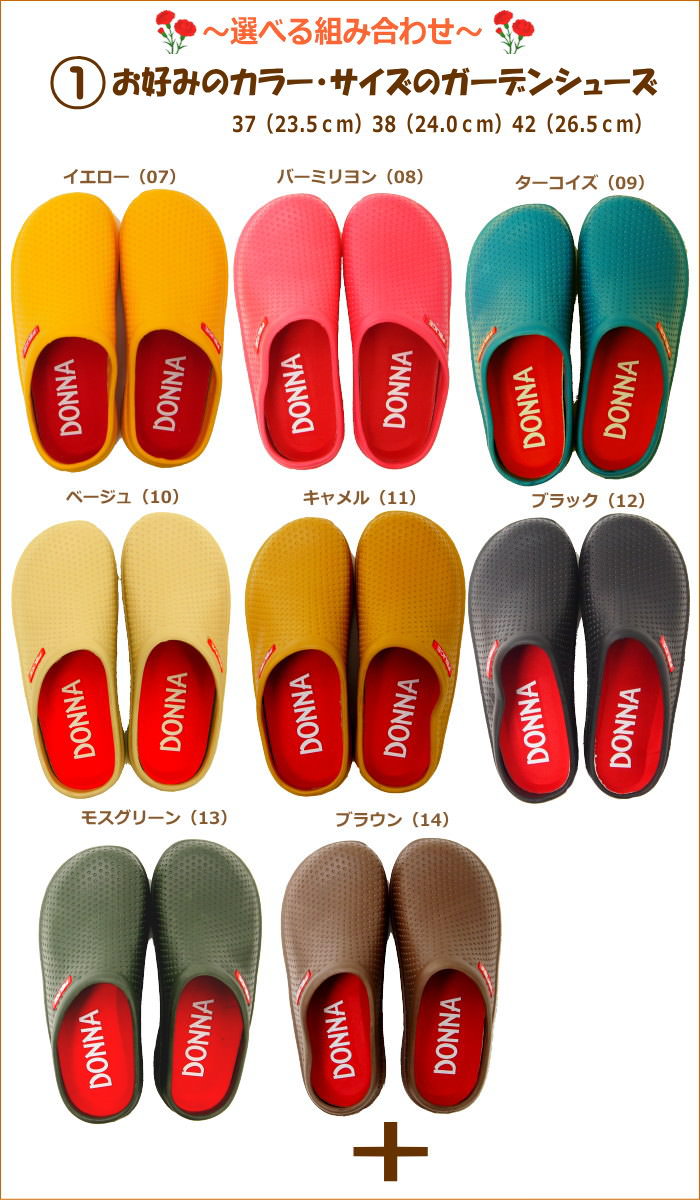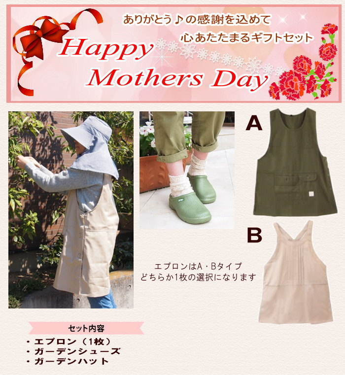 (ガーデンサンダル)詳しくはこちら Aタイプエプロン詳細は こちら Bタイプエプロン詳細は こちら (帽子)詳しくはこちら ・Spec 商品名 ガーデニング3点ギフトセット セット内容 【ガーデニングサンダル】 37:23.5cm(甲幅約9.5cm×長さ約24.5cm) 38:24.0cm(甲幅約10cm×長さ約25.5cm) 42:26.5cm(甲幅約10.5cm×長さ約27.5cm) 素材:EVA素材 【エプロン】 ●Aエプロン M〜L(フリーサイズ) バスト:79〜94cm 身長:154〜162cm 着丈:約78cm 身幅:約53cm ●Bエプロン M〜L(フリーサイズ) バスト:79〜94cm 身長:154〜162cm 着丈:約83cm 身幅:約53cm ポリエステル65% 綿35% 【帽子】 フリーサイズ つば長さ約10cm 深さ約10cm 頭周り約58cm ネックカバー約22cm 素材:ポリエステル、綿 詳しくはこちら