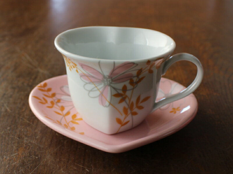 La briseハートカップ&ソーサー 2客セット スタイリッシュな花柄のハート形のカップとピンクのソーサー(小皿)の2客セットです。