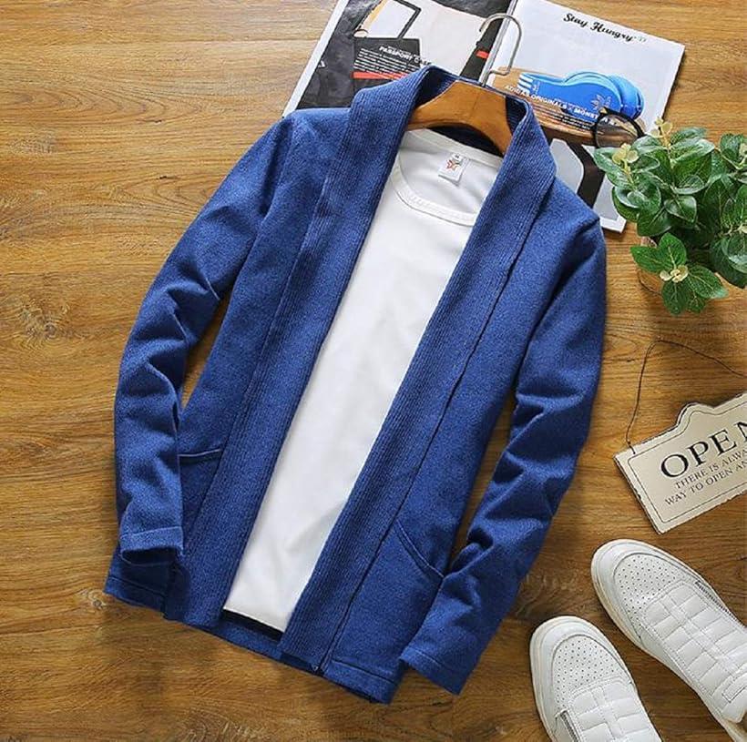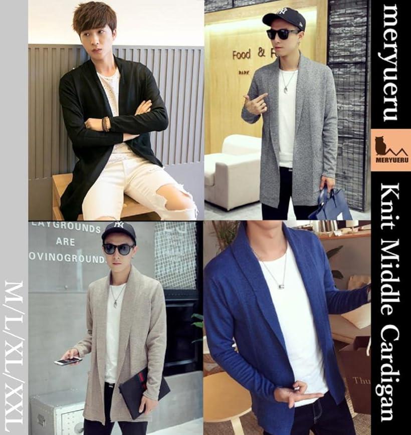 meryueru メリュエル ショールカラー ロング カーディガン オープン フロント 羽織り ソリッド スマート デザイン ミドル ニット ボタンなし 長め 丈 無地 オシャレ カッコイイ お兄系 大人 暖かい スリム 春(ブルー, XL)