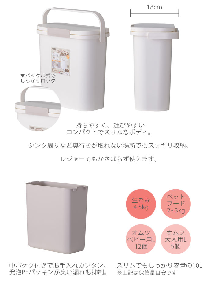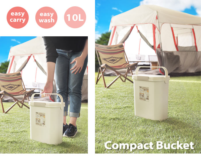 商品 コンパクトバケツ サイズ 幅31.8×奥行18×高さ32.3cm 素材 本体・中容器・蓋・バックル・ハンドル:PPパッキン:発泡PE カラー ホワイト 容量 10L 生産 日本 完成品 備考 お手入れカンタン、持ち運びも便利なコンパクトバケツ。