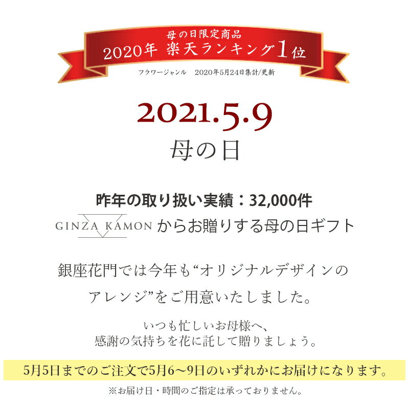 ■サイズ W20cmH20cm ■商品内容 銀座花門がおすすめする銀座らしい大人なイメージでお作りした母の日アレンジメントです。
