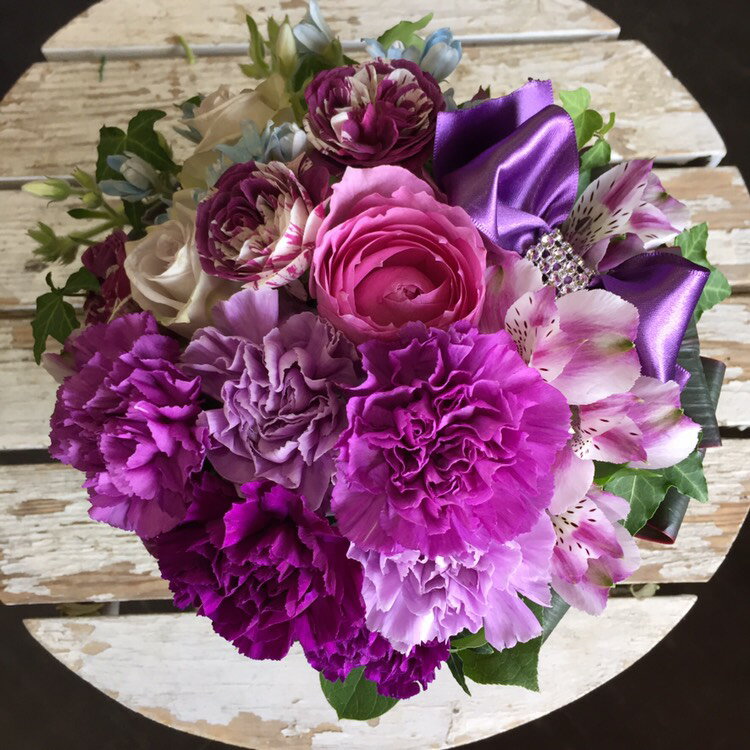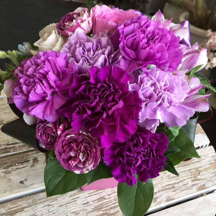 ■商品内容限定仕入のカーネーション、ムーンダストを使用したシックなアレンジメント!母の日の贈り物にどうぞ!ムーンダスト(カーネーション)季節のお花が入ります ■形態生花アレンジメント ■色目パープル系 ■サイズ高さ約23センチ幅約20センチ奥行き約20センチ ■メッセージカード母の日カードをお付け致します。